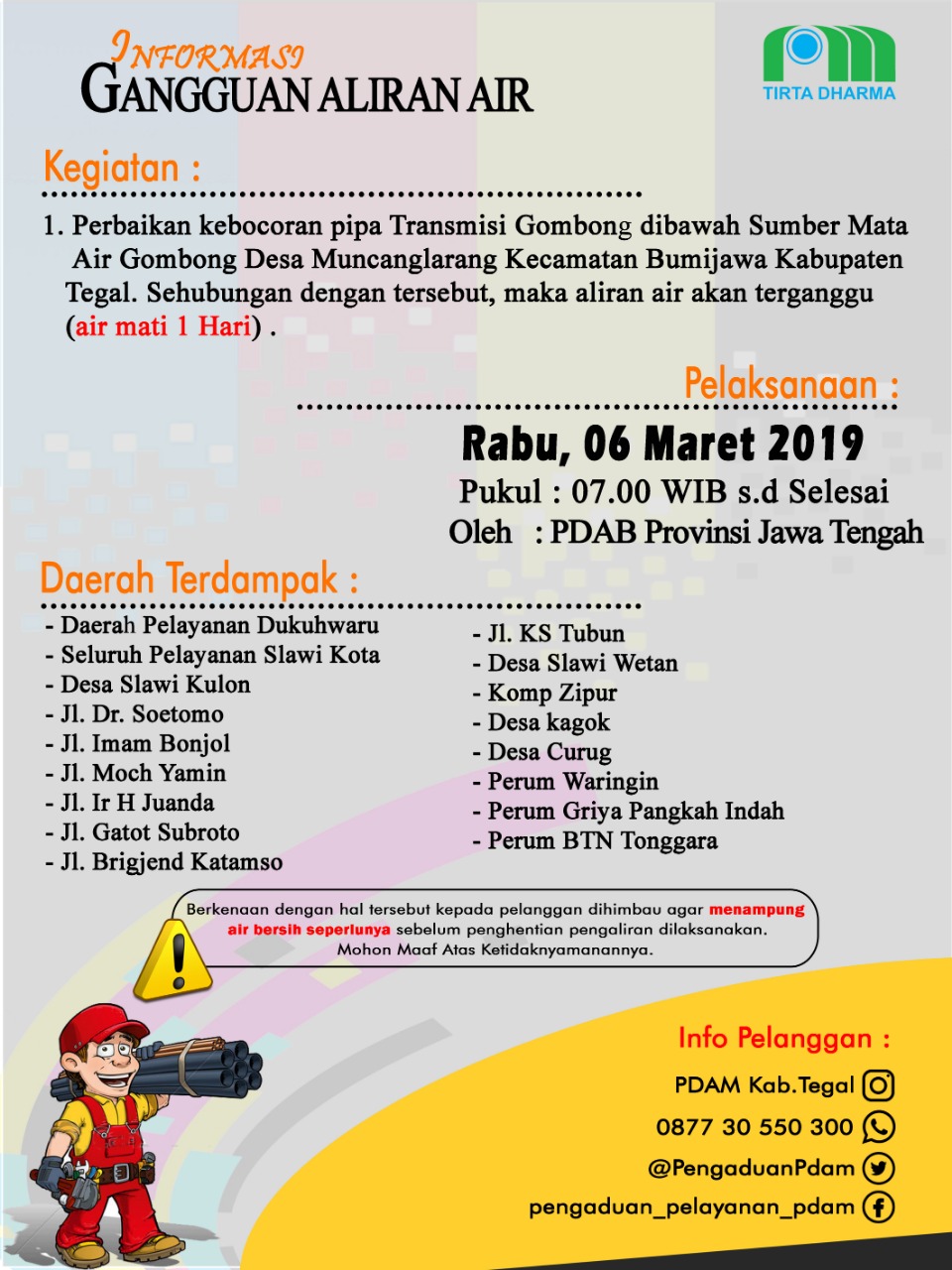 Perbaikan Pipa Transmisi Gombong Oleh PDAB Prov. Jateng / Info Gangguan Air / Oleh Perumda Air Minum Tirta Ayu Kab. Tegal Informasi Gangguan Saluran Air (06/03/2019) Post Views: 84